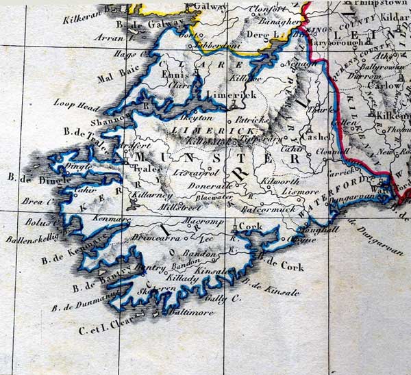 Cork is deservedly reckoned the second city in Ireland in magnitude, riches and commerce. It lies one hundred and twenty miles south-west of Dublin and contains above eight thousand five hundred houses. Its haven is deep and well sheltered form all winds; but small vessels only can come up to the city, which stands about seven miles up the river Lee. This is the chief port of merchants in the kingdom; and there is, perhaps, more beef, tallow and butter shipped off here, than in all the other ports of Ireland put together. Hence there is a great resort of ships to this port, particularly of those bound from Great Britain to Jamaica, Barbadoes and all the Caribeen islands, which put in here to victual and complete their lading.