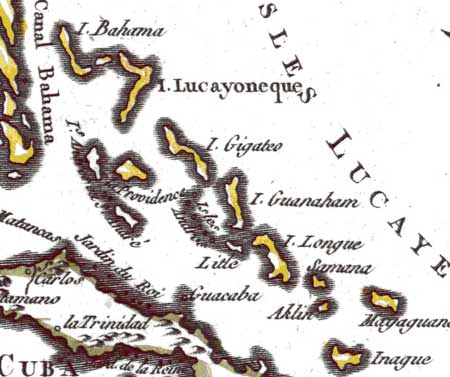 The Bahamas are situated to the south of Carolina between twelve and twenty-eight degrees north latitude and seventy-three and eighty-one degrees west longitude. They extend along the coast of Florida quite down to the Isle of Cuba; and are said to be five hundred in number, some of them only mere rocks; but twelve of them are large, fertile and in nothing different from the soil of Carolina. They are however, almost uninhabited except Providence, which is two hundred miles east of the Floridas; though some others are larger and more fertile, on which the English have plantations. Between them and the continent of Florida is the Gulph of Bahama, or Florida, through which the Spanish galleons sail in their passage to Europe. These islands were the first fruits of Columbus's discoveries; but they were not known to the English till 1667 when Captain Seyle, being driven among them in his passage to Carolina, gave his name to one of them, and being a second time driven upon it, gave it the name of Providence. The English, observing the advantageous situation of these islands for a check on the French and Spaniards, attempted to settle them in the reign of Charles II. Some unlucky incidents prevented this settlement from being of any advantage, and the isle of Providence became a harbour for the buccaneers or pirates who for a long time infested the American navigation. This obliged the government in 1718 to send out Captain Woodes Rogers with a fleet to dislodge the pirates and for making a settlement. This the captain effected; a fort was erected, and an independent company was stationed in the island. Ever since this last settlement these islands have been improving, though they advance but slowly. In time of war, people gain considerably by the pirates condemned there; and at all times by the wrecks, which are frequent in this labyrinth of rocks and shoals. The Spaniards captured these islands during a former war but they were retaken by a detachment from St Augustine, April 7th, 1783. The chief town is Nassau.