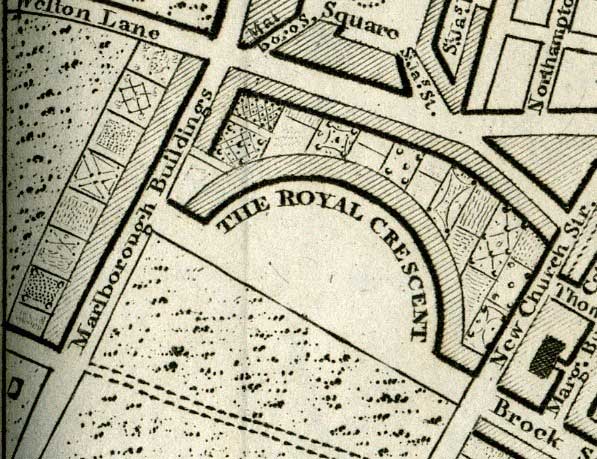 Higher up is the Royal Crescent, a majestic assemblage of buildings of an elliptical form, with a single order of Ionic pillars, supporting the lower cornice. It consists of thirty elegant houses, with a fine lawn in front, declining towards the Avon, and commands a very extensive prospect over the city and the opposite hills. By the west end of this Crescent runs that beautiful and airy pile called Marlborough Buildings.