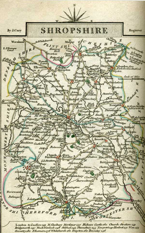 Shropshire is an inland county, which, during the Saxon heptarchy, belonged to the kingdom of Mercia. It is now in the province of Canterbury, the dioceses of Hereford in part, and the remainder in that of Litchfield and Coventry, and is included in the Oxford circuit. It is 47 miles long, 38 broad, and 210 in circumference; containing 1320 square miles, divided into 15 hundreds, 170 parishes, and 15 market towns, viz. Shrewsbury, the county town, which fends 2 members to parliament, and gives the title of Earl to the Talbot family; as does Ludlow that of Viscount to the family of Herbert, and sends 2 members to parliament; as does Bridgenorth, Wenlock, and Bishop's Castle, 2 members each ; besides which, there are Drayton, Wem, and Oswestry, which latter gives the title of Baron to the Howard family; Whitchurch, Church Stretton, Cleobury, Newport, Shefnal, and Wellington; with Ellesmere, which gives the title of Baron to the Egerton family. The following villages give titles to noble families, viz. Clun, that of Baron to the family of Howard; Cherbury, the same title to that of Herbert; Harley, to that of Harley; and Powis, that of Earl and Baron to the family of Herbert. The principal rivers are the Tweed, Severn, Teem, Clun, Ony, Warren, Torn, Corve, Rea, Kemlot, and Mele. The most remarkable places are Wire, Morf and Hocifo Forests ; St. Gilbert's Caradock, Wrekin, Stipperston, Titterston Hill, Browncle, Brethen, Cleobury Mount, Burning Well, Bishop's Moot, Corvesdale, and Blaze Heath; Boscobel House and Grove, Caractacus's Camp, with Acton Burnell Castle and Barn. It sends 12 members to parliament, viz. 2 for the county, and 10 as before shewn; pays 7 parts of the land tax; and provides 640 men to the national militia. The air of this county is healthy, but cold. The soil in the vallies produces different sorts of grain, and upon the hills pasture for black cattle and sheep; besides which its chief produce is fruits, river fish, pit-coal, copper, lead, iron, stone, lime-stone, pitch, and tar. Its manufactures are gloves and stockings, woollen cloths, flannels, and cannon. It is reckoned the largest inland county in the kingdom.