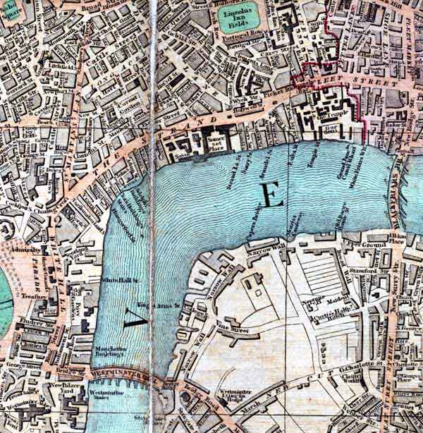 The Temple is an irregular building . In Fleet-street are two entrances, one to the Inner and the other to the Middle Temple. The latter has a front in the manner of Inigo Jones, of brick, ornamented with four large stone pilasters of the Ionic order with a pediment. The garden of the inner Temple is not only a most happy situation but is laid out with great taste and kept in most perfect order. It is chiefly covered with green sward, which is pleasing to the eye, especially in a city and is most agreeable to walk on. It lies along the river ; is of great extent , and has a spacious gravel walk, or terrace, on the water's edge . It forms a crowded promenade in the summer; and at such time is an interesting spot.