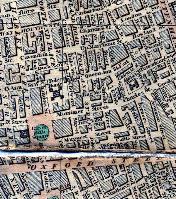 Crossing Oxford Street, Holles Street lads us into Cavendish Square, which is spacious and well built, having a circular shrubbery, containing a gilt equestrian statue of William Duke of Cumberland enclosed in its centre. Wigmore Street branches off from the north-west angle of this square; it is a well built street inhabited by persons of the first fashion; in continuation of this is Edward Street from which a short avenue leads into Manchester Square.