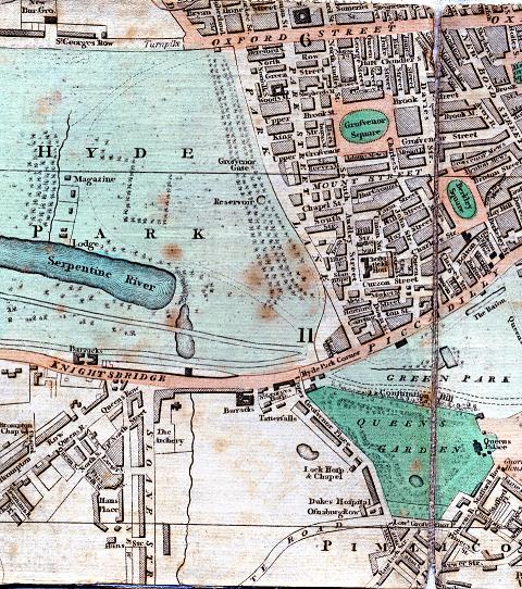 Entering Bond Street , famous for its shops and its loungers, we proceed through Bruton Street to Berkeley Square , and continuing to walk through Davies Street and Grosvenor Street enter Grosvenor Square, which is surrounded by extremely grand though not uniformly built houses .The centre of the square is occupied by a handsome shrubbery, neatly railed in and containing a gilt equestrian statue of George I. This square takes its name from Sir Richard Grosvenor, Bart, ancester of Earl Grosvenor who first projected it.