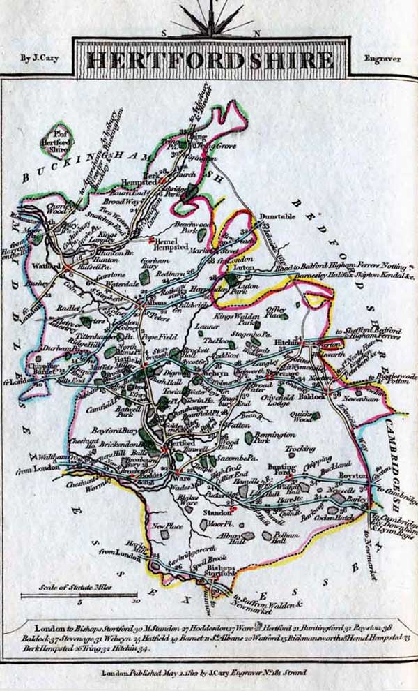 Hatfield, a market town. It was part of the revenue of the Saxon princes, till it was besieged by Edgar on the monastery of Ely. When that abbey was converted into a bishopric, it became the residence of the prelates, and hence called Bishop's Hatfield. The manor and palace were alienated from the crown in the reign of Elizabeth. William of Hatfield, second son of Edward III was born here. Queen Elizabeth resided here many years before she came to the throne. Here, in 1587, she was visited by queen Mary ; and hence, on her death, she was conducted to ascend the throne. James I exchanged this place for Theobalds with Sir Robert Cecil, afterwards earl of Salisbury. The present house was built by him. Charles the First was here when a prisoner to the army. In this house are several fine paintings. On the l. is Miller's-park, belonging also to the marquis of Salisbury. Two miles on the l. is Brocket-hall, viscount Melbourne.