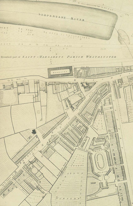 The site of the manor of Hyde constitutes, no doubt, Hyde Park, which adjoins to Knightsbridge, on the north, lying between the two roads which lead to Hounslow and - Uxbridge. Hyde Park was seized among the crown lands, soon after the death of Charles 1. and was excepted from sale, with some other royal demesnes, by an ordinance of parliament in 1649. Three years afterwards it was resolved that Hyde Park, with some other lands, should be sold. After the Restoration, when the crown lands were resumed into the king's hands, this park was replenished with deer, and surrounded with a brick wall, having before that time been fenced with pales. The park has been considerably reduced in extent since the survey above-mentioned, partly by the building of dwelling houses, but principally by the making of Kensington Gardens. Its present extent, according to a survey taken in 1790 is 394 a. 2r. 38 p. In the upper part of the park adjoining to Kensington Gardens, are some fine trees, and the scenery is very pleasing. The large canal called the Serpentine river (which has so often proved fatal to adventurous skaiters and desponding suicides) was made about the year 1730, by order of Queen Caroline.